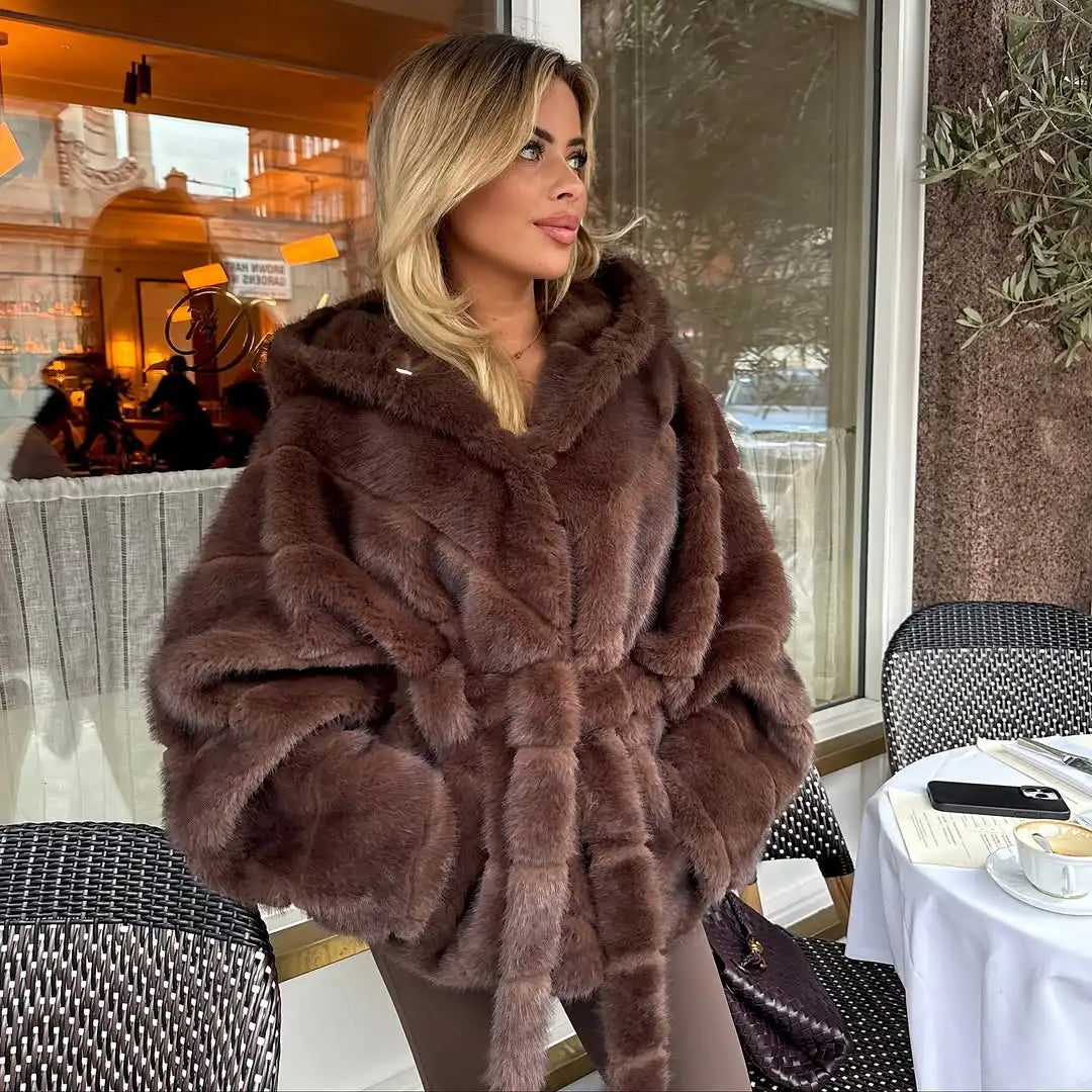 Luxury Hooded Lace Up Faux Fur Coat Women Elegant V-neck Long-sleeved Loose Warm Jacket Lady Winter Daily High Street Outerwear