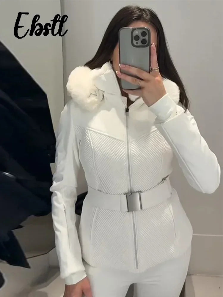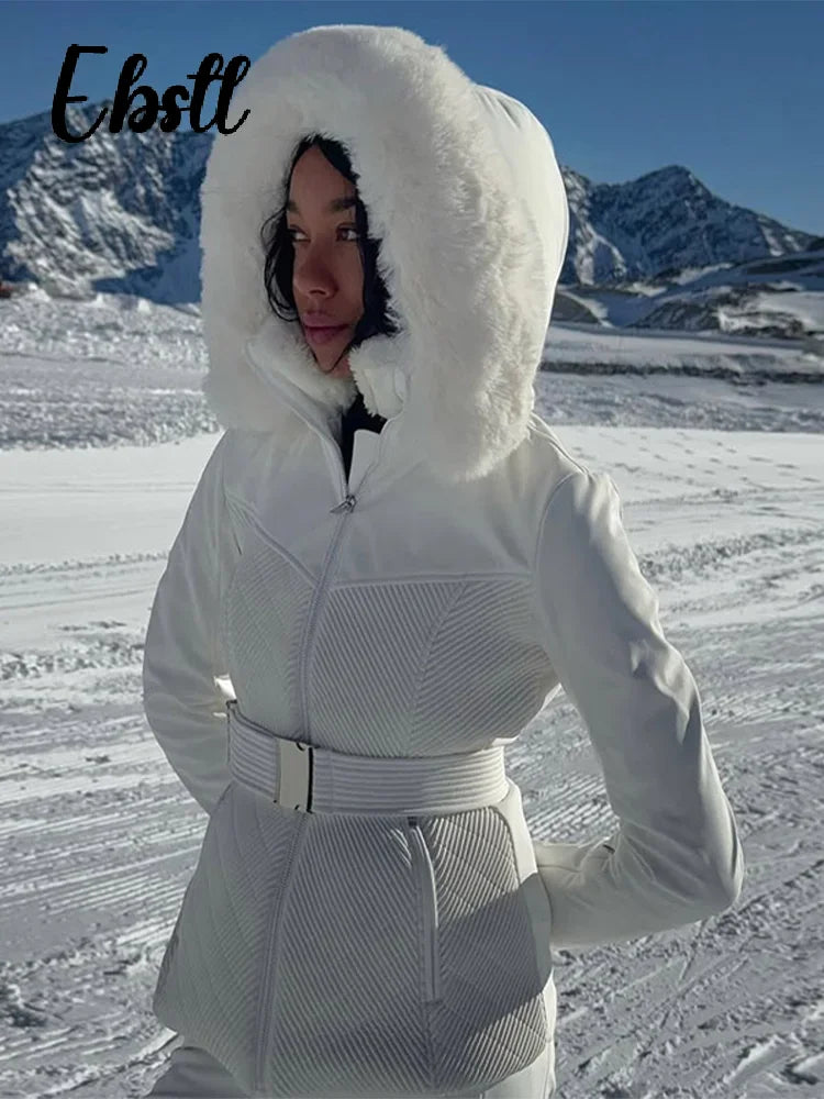 Windproof Fur Splicing Hooded Coat Pants Set Women's Warm Zipper Belted Snowboard Jackets 2025 Winter New Ladies Skiing Outfit